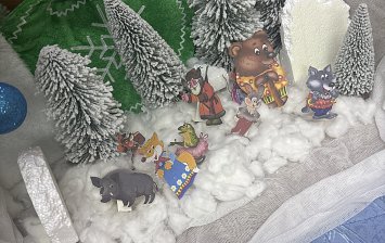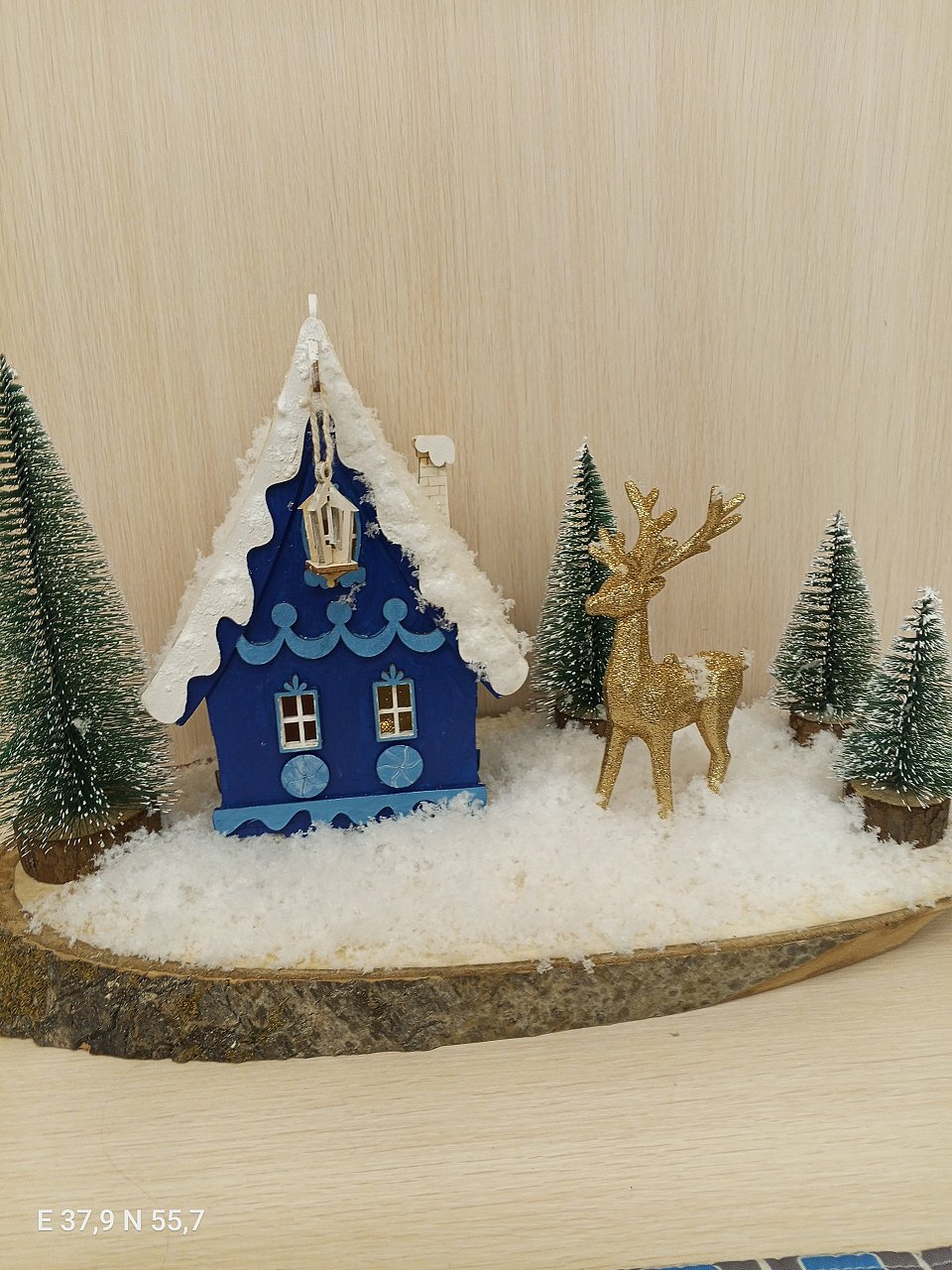 Деревянный домик, на деревянной подставке, леснсные елочки.