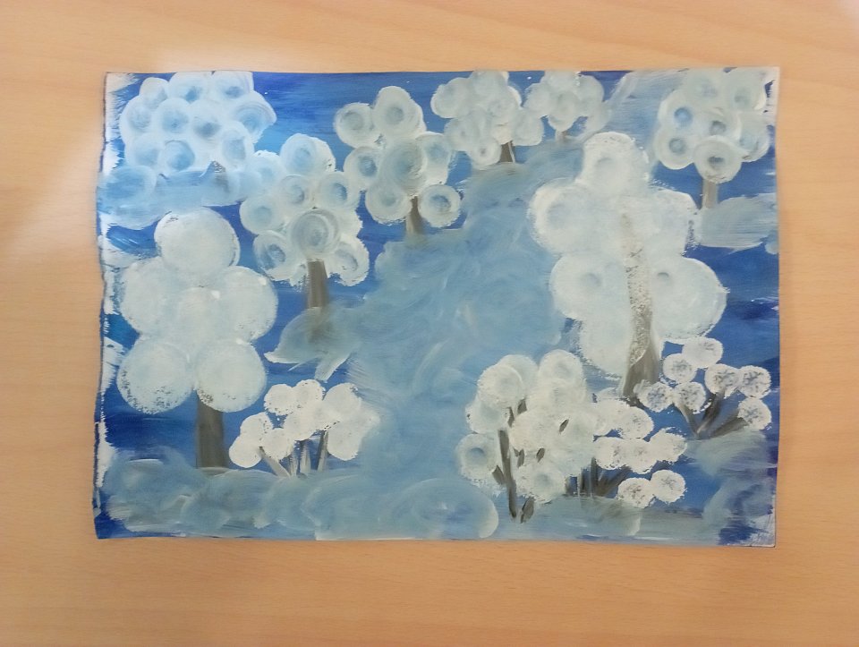 7 лет. Нетрадиционная техника рисования (поролон). Гуашь, кисть Б3, поролон круглой формы разного размера, непроливайка, лист бумаги