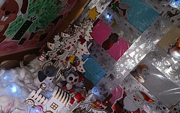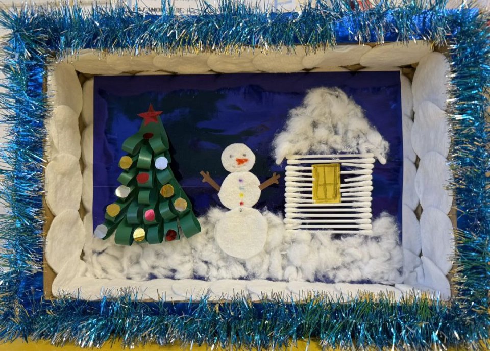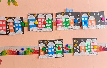 5 лет. Материал: вата, ватные палочки, ватные диски, цветная бумага, мишура на картонном основании.