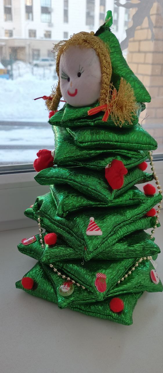 Участница: 4 года. Для создания "Ёлочки" использовался атласный материал для подушечек (внутри синтепон), игрушки из фетра (прикрепили с помощью клея), косичка из ниток, голова из ткани -кулирки(сшита и наполнена синтепоном), рот и ресницы нарисованы фломастером, глаза и нос вышиты.