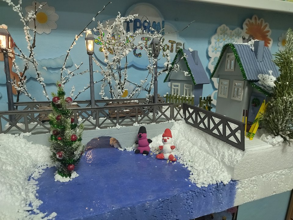 Возраст участника 5 лет. Объёмная работа, макет зимнего городка маленьких зимних друзей Снеговичков, которые любят весело кататься на катке. В этом городке есть домики весёлых друзей, выполненных из картона. Снеговички могут не только покататься на катке, но и на лыжах, и санках, которые стоят около домиков. Могут прогуляться по небольшой зимней аллеи, посидеть вечером на скамеечках под приятно излучающими мягкий свет фонарями!