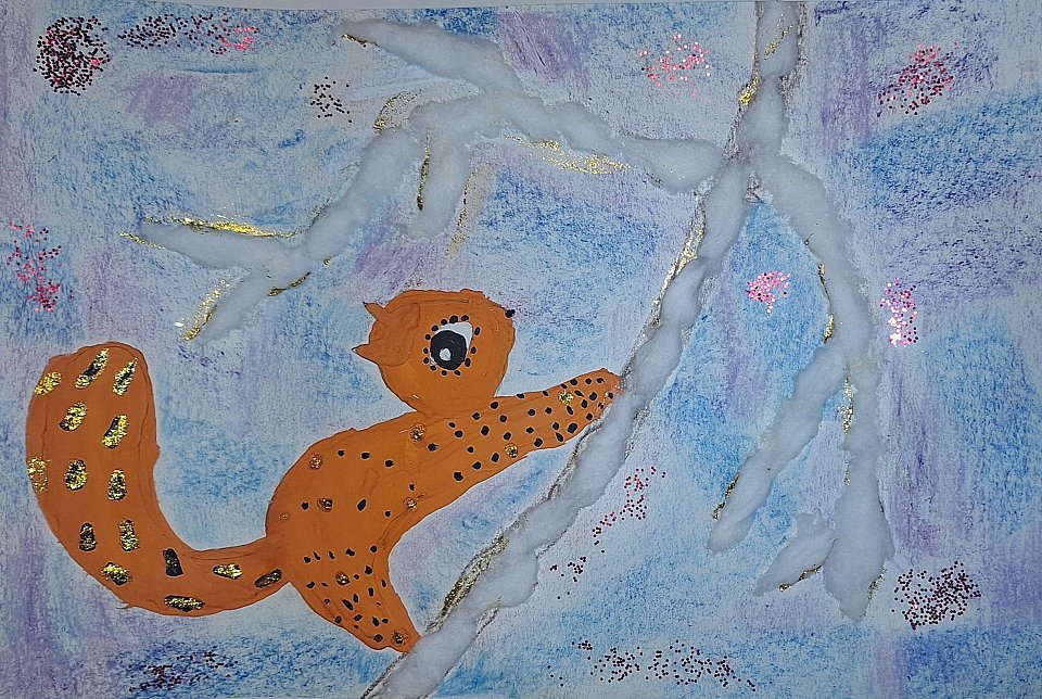 Работа Коневой Анастасии (8 лет) выполнена гуашью с применением ваты и блесток на листе А-3 формата.