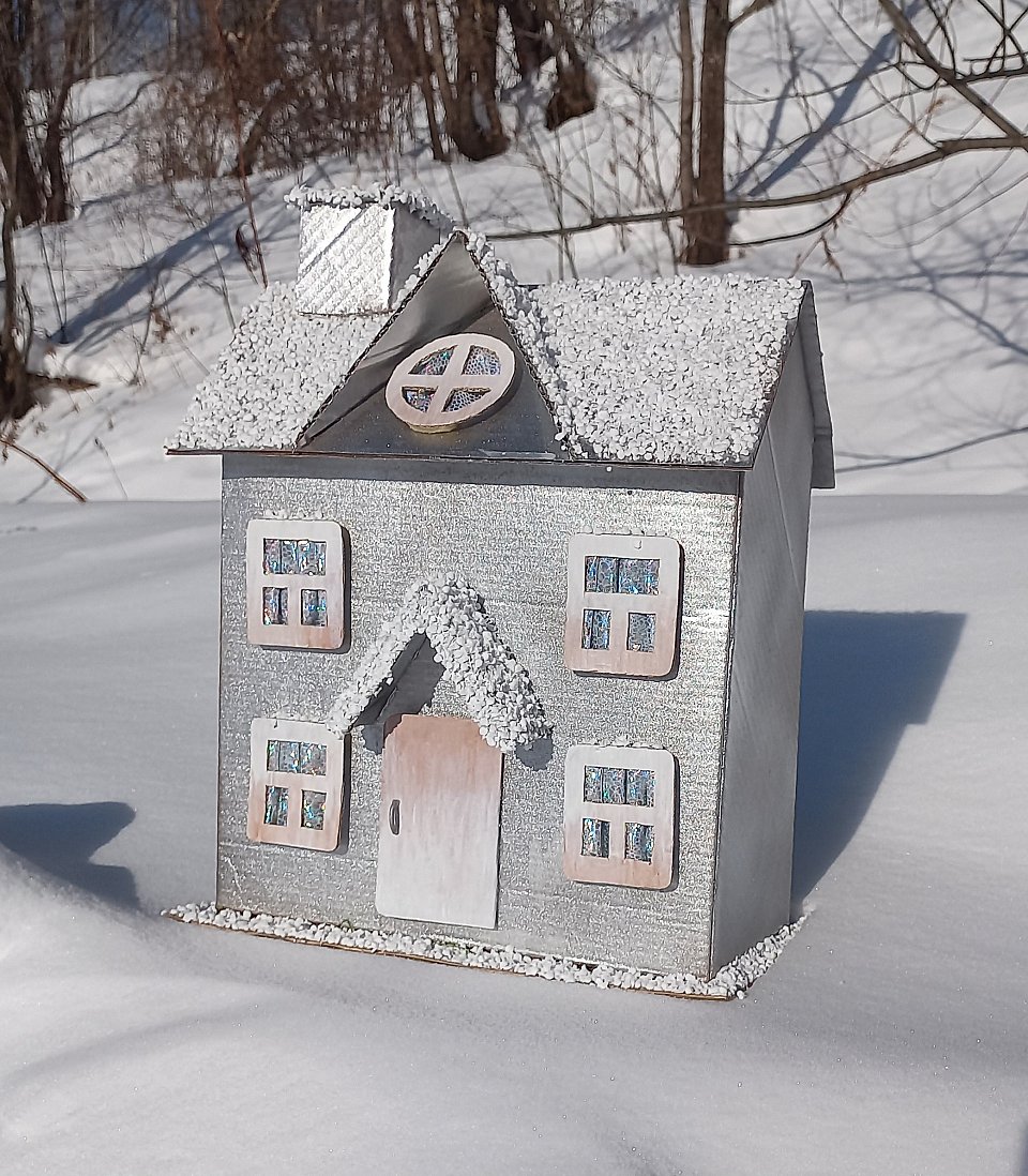 8-9 лет Поделка из картона Баллончик серебристой краски для покрытия, серебристая ткань, горошины пенопласта имитирующие снег, клей