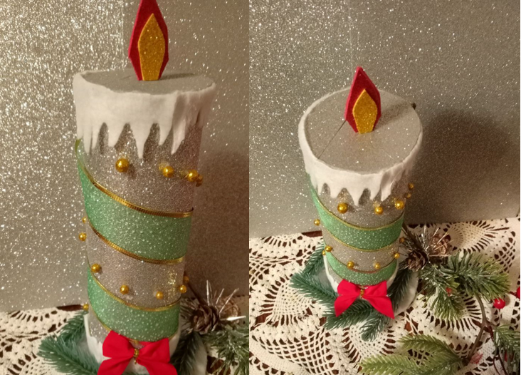 9 лет, картонная банка из под чипсов,глиттерный фоамиран,искусственные ветки ели, пенопластовые шарики, шишки ели,тесьма, клей -пистолет