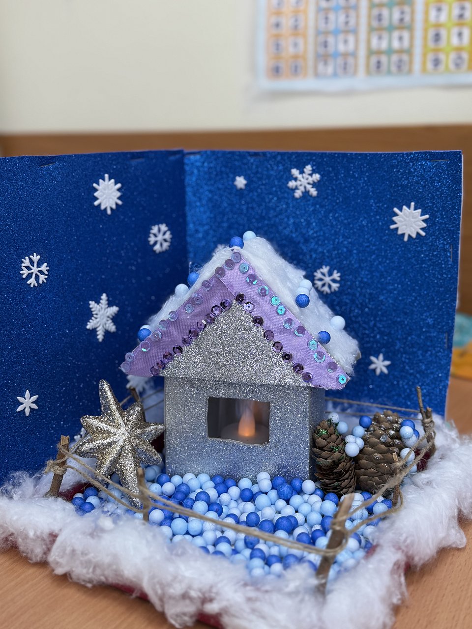 7 лет (ОВЗ).На фото представлена композиция зимней избушки в лесу.В процессе работы использовались следующие материалы:коробки из-под продуктов,вата,фоамиран,шишки,веточки,пенапластовые шарики и др.