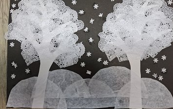 работу выполнил ученик 2 класса, используя технику- аппликация ( бумага, вата, акварель)