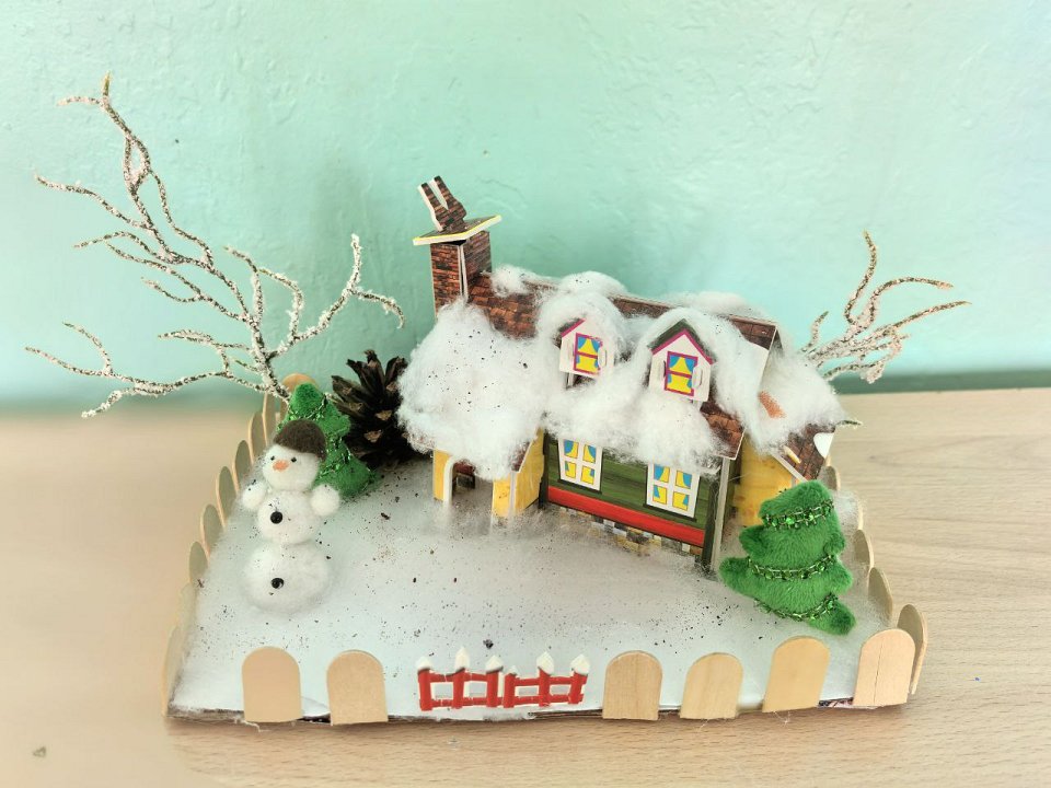8 ЛЕТ. Работа выполнена с помощью картона, ваты, часть ветки от дерева, клей, сшитые елочки.
