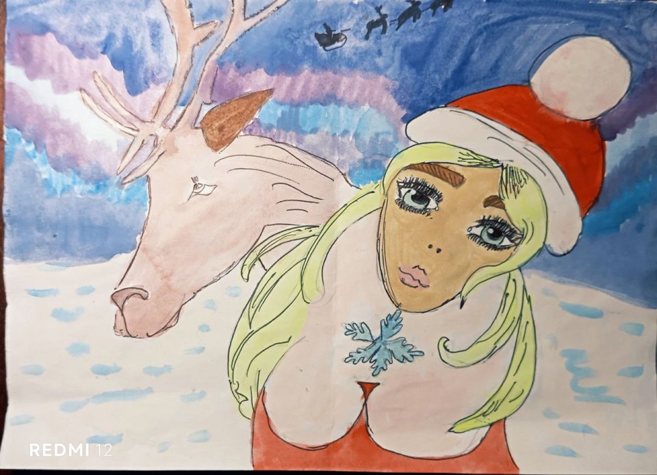 Снегурочка провожает Деда Мороза тихим северным вечером