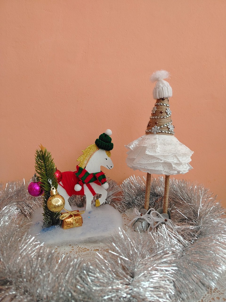 Возраст участка 2 года. Техника исполнения: поделка. Использованные материалы: картон, веточка ели, ёлочные игрушки, подарочная коробка, шарфик, шапочка.