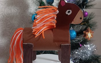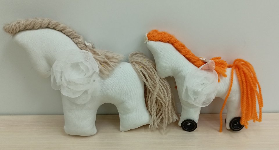 Лошадки сшиты из белой ткани, наполнены ватой. Грива и хвост из оранжевой пряжи.