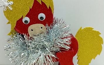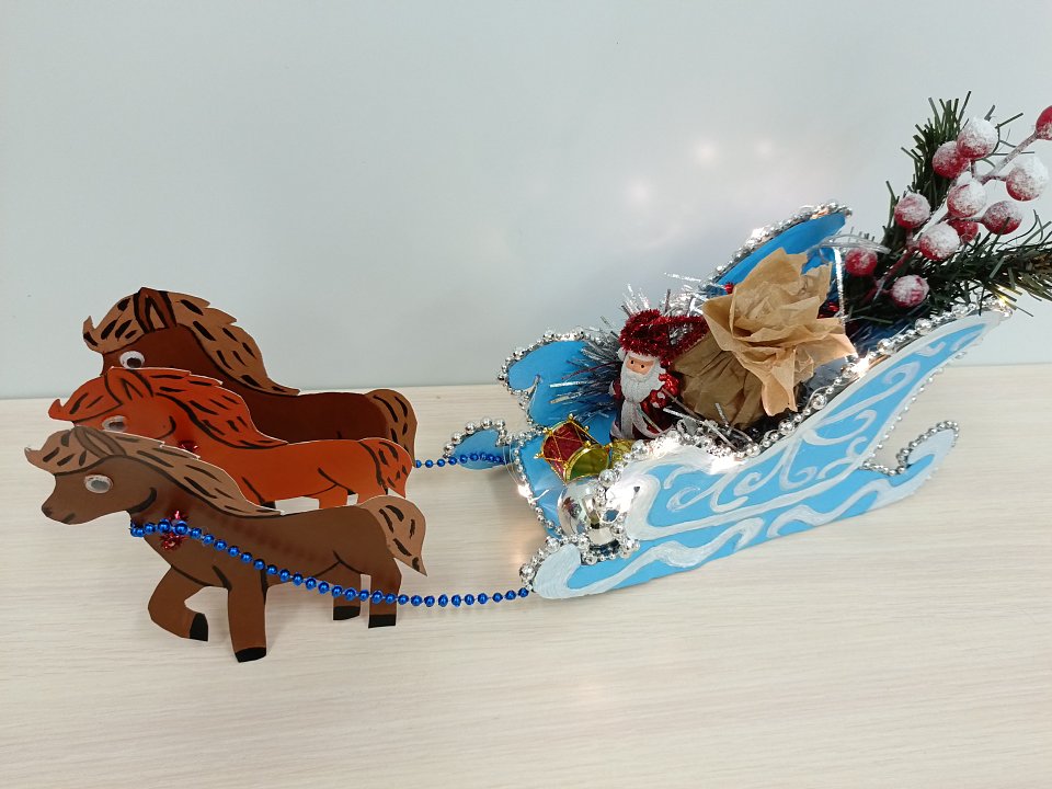 Работа выполнена из картона, мишуры, бус, клей, цветная бумага, краски