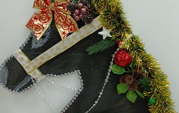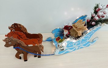 Работа выполнена из картона, красок, мишуры и тесьмы