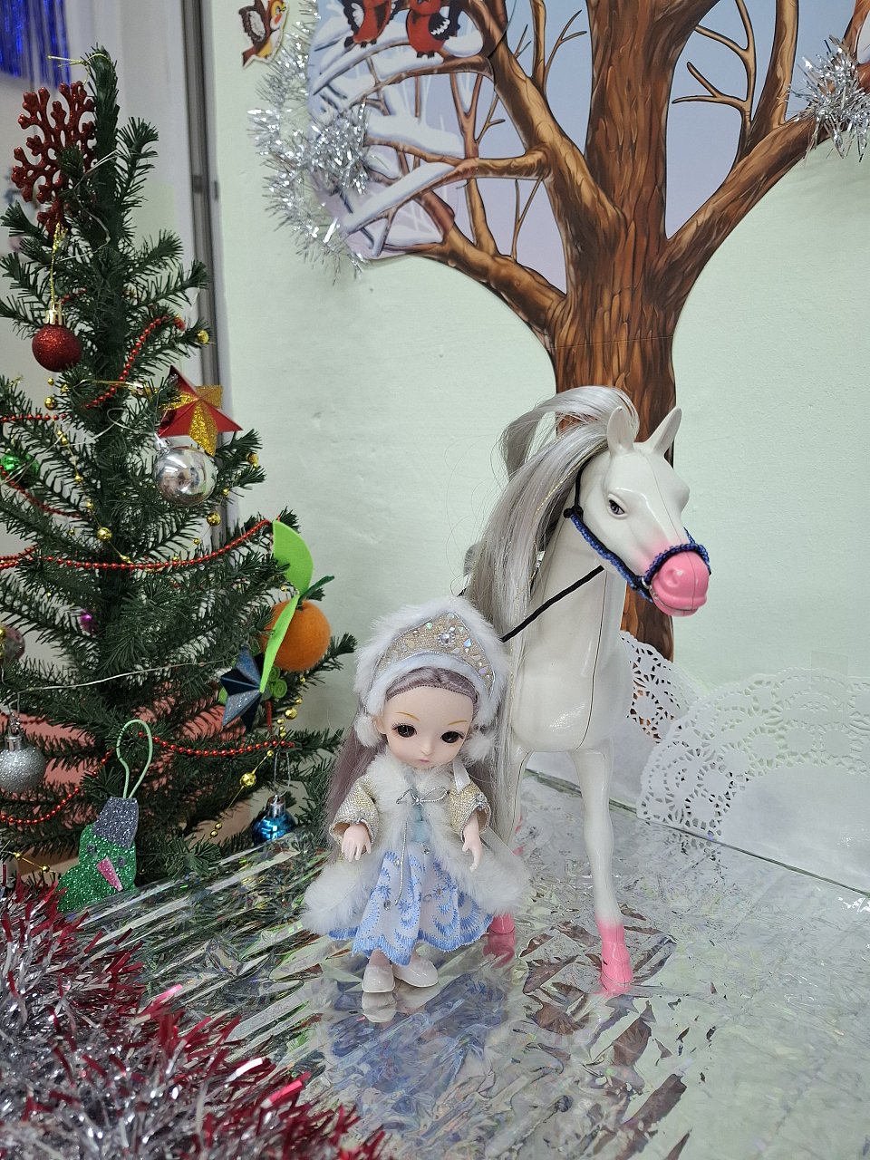 Работа выполнена из пластмассовых игрушек с применением метода моделирования. На куколку сшита одежда и кокошник в стиле "Снегурочка". На лошадку сшито седло и украшено в праздничном стиле.