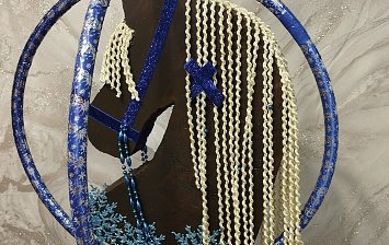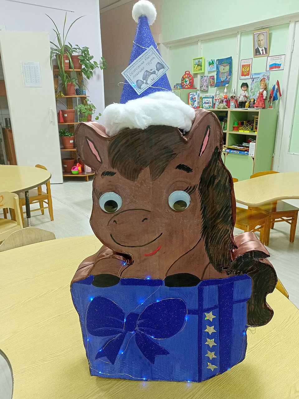 Лошадка сделана из картона, раскрашена гуашью, также использована гирлянда и атласная лента.