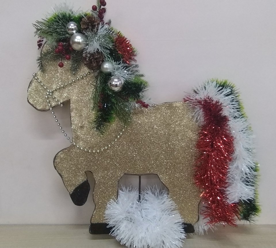 Работу выполнил Смородинов Константин, 8 лет. Лошадка изготовлена из картона, фоамирана, украшена мешурой и елочными игрушками.