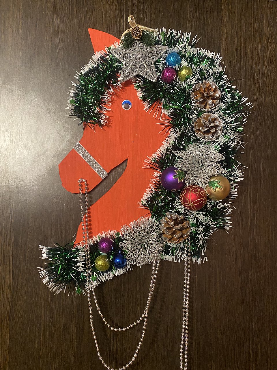 Виктория-8 лет. Изготовление символа года из картона и мишуры, с добавлением елочных игрушек , шишек и бусин.яркая быстрая поделка, которая украсит и придаст новогоднее настроение