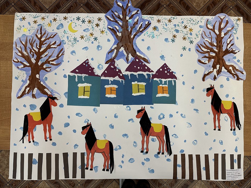 Ученикам выполнившим работу от 8 до 9 лет, ребята рисовали красками снежинки, снег, деревья, создавали аппликации: дома, лошадок, забор, клеили звезды и блестки