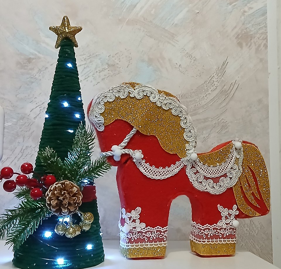 Работы выполнена их плотного картона обтянутая флисом красного цвета. Отдекорировано ажурным кружевом, золотым фетром и помпонами белого цвета.