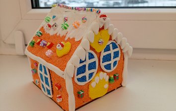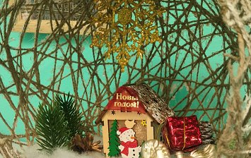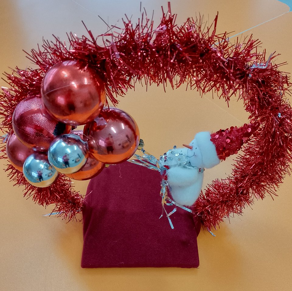 Работа выполнена из мишуры, ваты, ёлочных шаров, новогоднего дождя, проволоки