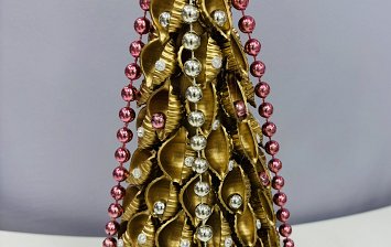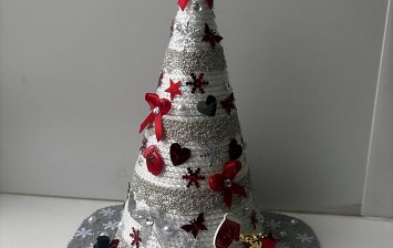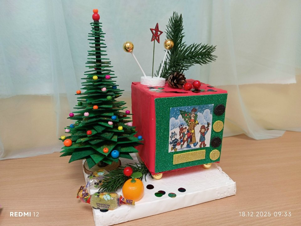 Работа выполнена девочкой 5 лет. Применили материал картон, фоамиран, бусинки, шишки, ветки искусственной елки, игрушка мандарин, конфета.