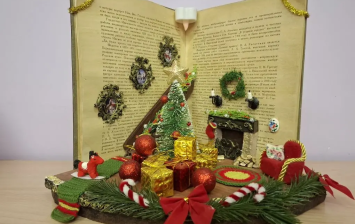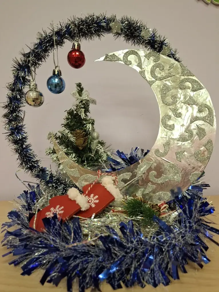 6 лет, работа выполнена из картона, мишуры, елочных игрушек