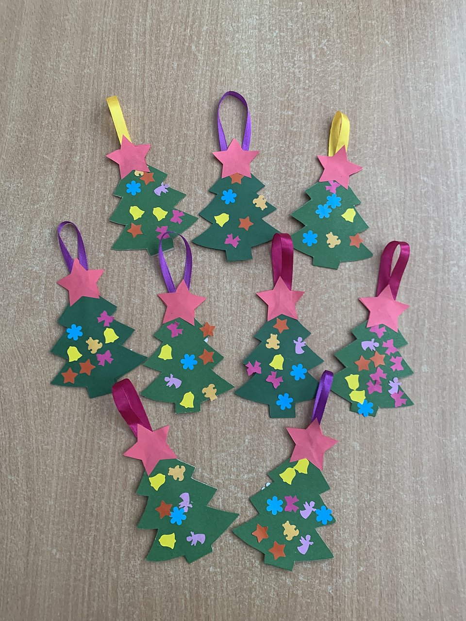 Ёлочки промазываются клеем и склеиваются, предварительно поместив между ними ленточку. Последним этапом приклеиваются звезды с обеих сторон на верхушку ёлочки.
