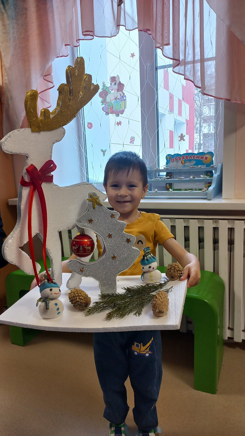 4 года,картон,фоамиран, клей,шишки, веточка ели,елочная игрушка, пенопласт