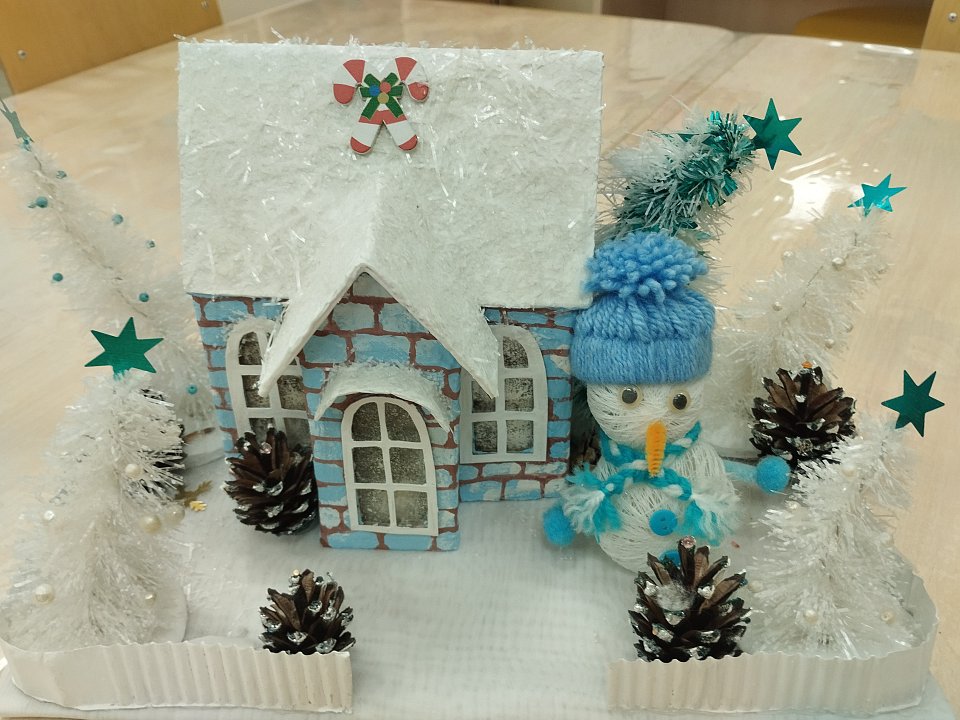 Поделка выполнена из картона, ткани, ниток с использованием природного материала