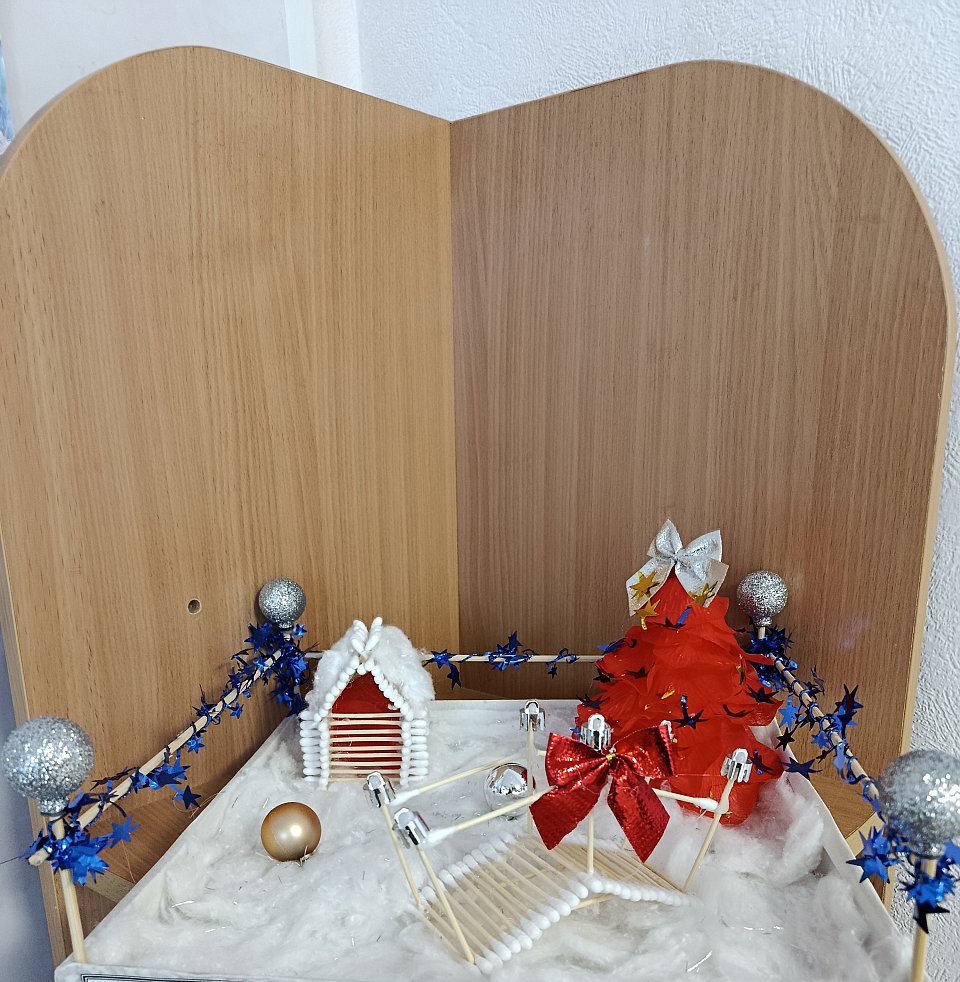 6 лет, вата, ватные палочки, клей, мишура, стеклянные шарики.