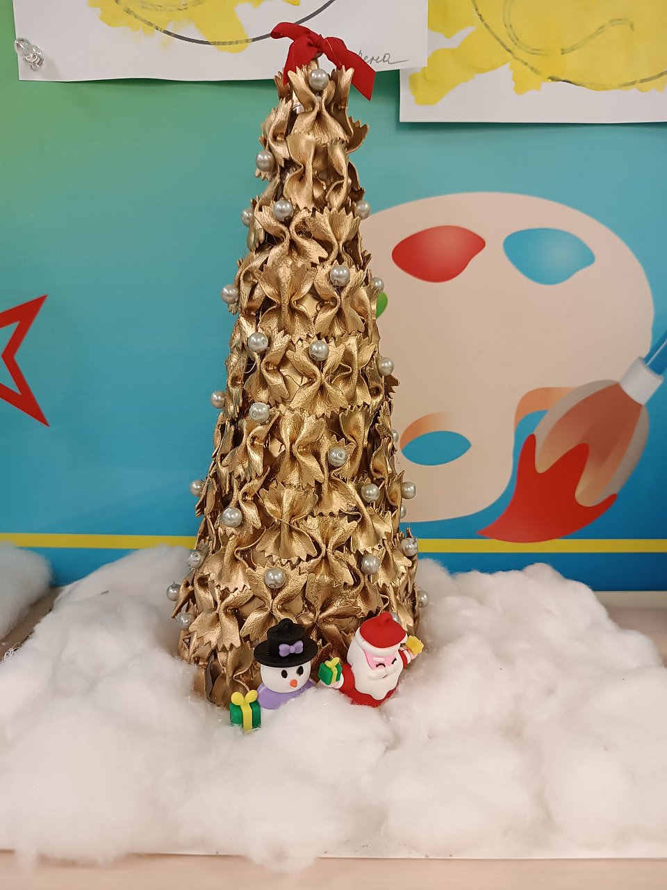 Работа выполнена из макарон, которые покрасили золотой краской. Украшения на ëлке- бусинки.