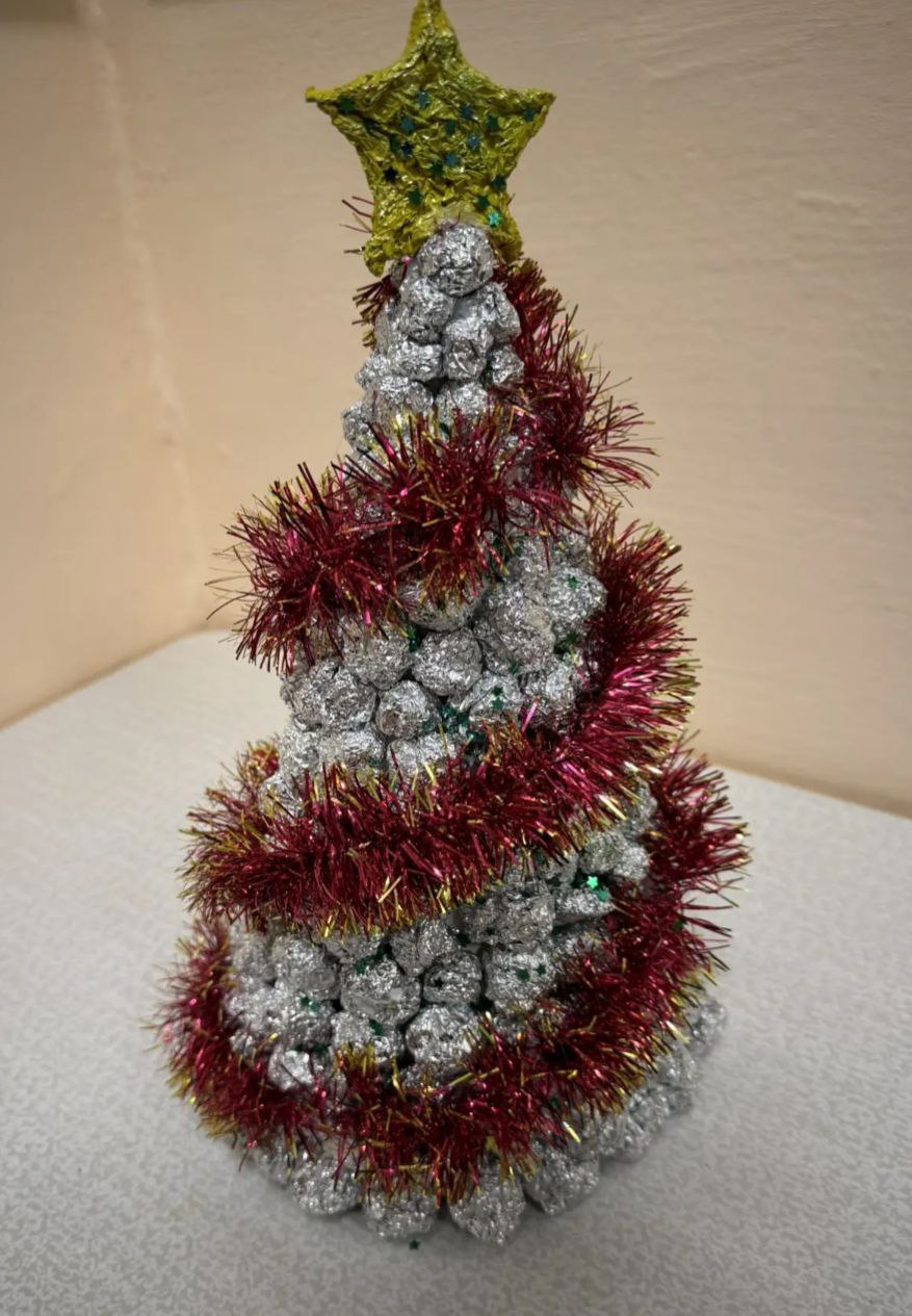 5 лет. Материал: картон, бумага, фольга, солёное тесто, гуашь, мишура.
