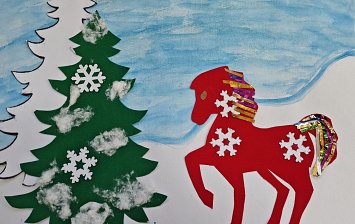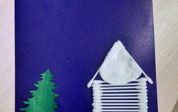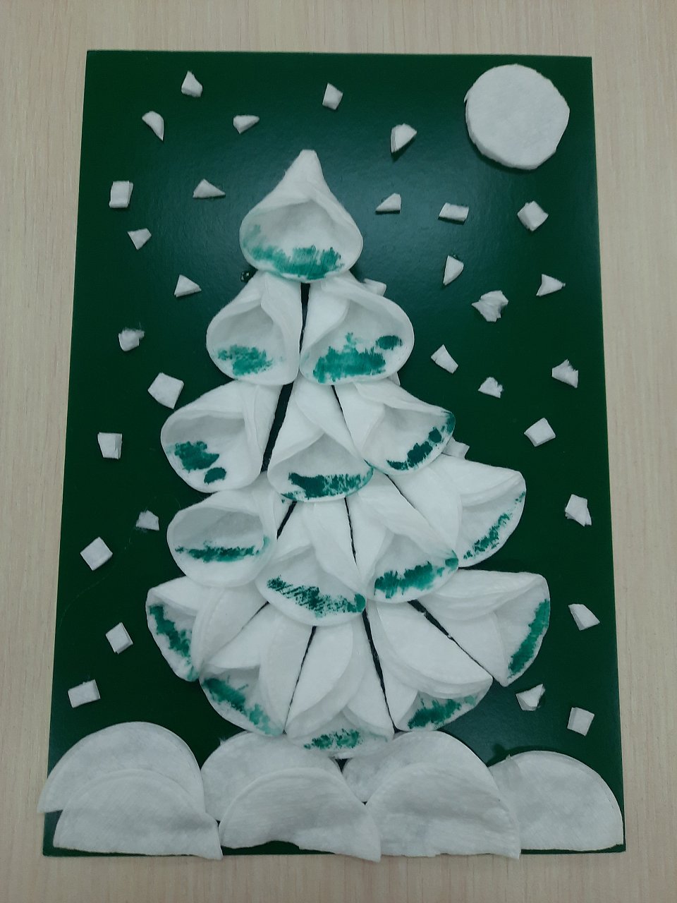 Работа выполнена из подручных материалов- ватные диски. Сперва Мелина с воспитателем с помощью клея соединила уголочки дисков в виде треугольника, затем наклеила их в форме елочки. Зелень на елке нанесла с помощью акварельных красок. Луна из ватного диска, снег мелко нарезан из того же материала. Работа выполнена на картоне А4.
