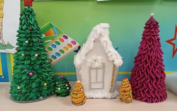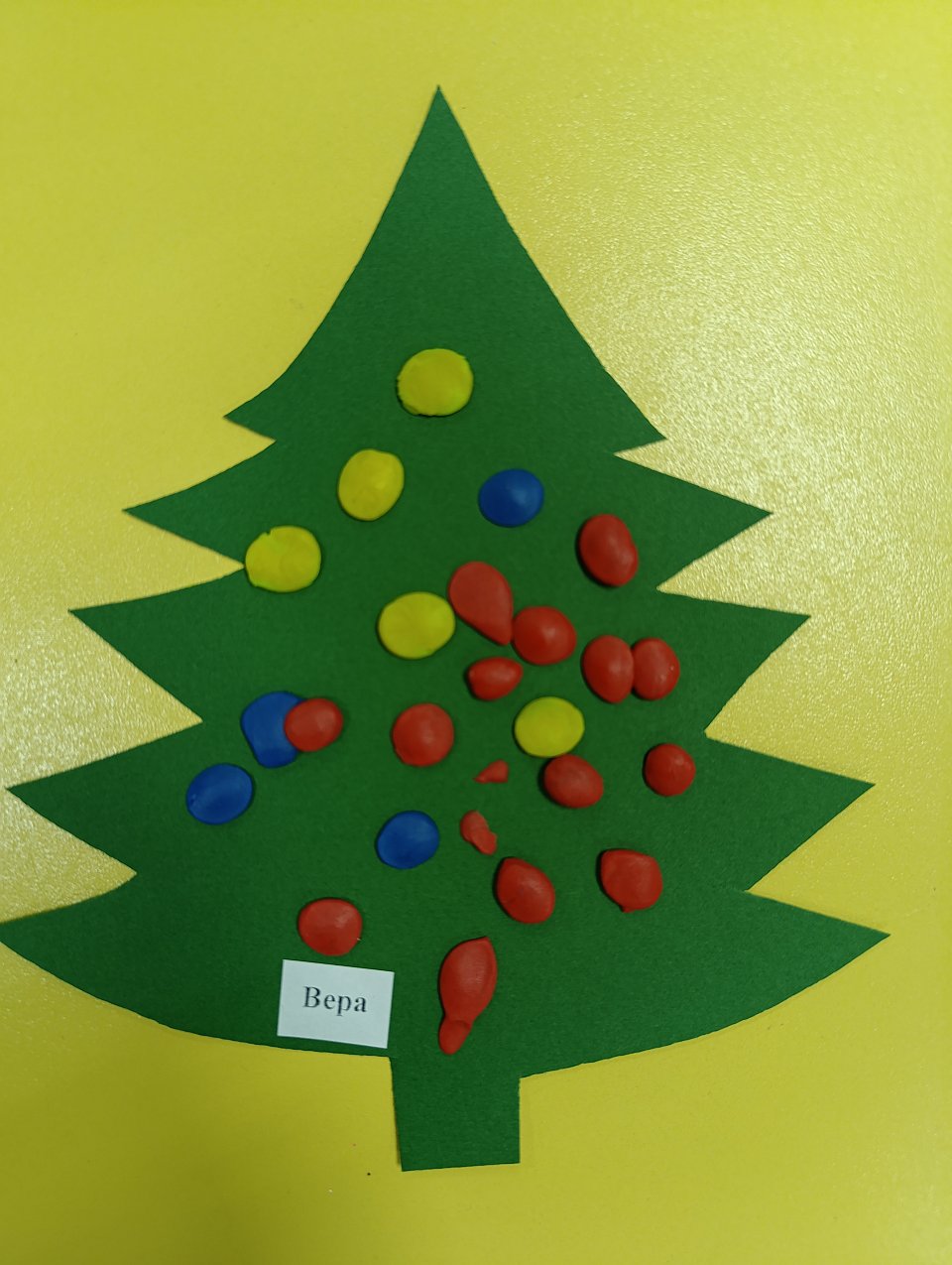 3 года.Работа выполнена в технике лепки.Использованные материалы: картон зелёного цвета, пластилин красного,синего и желтого цветов.