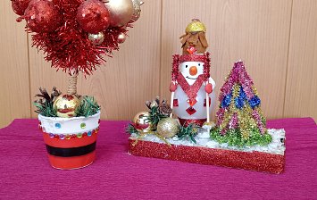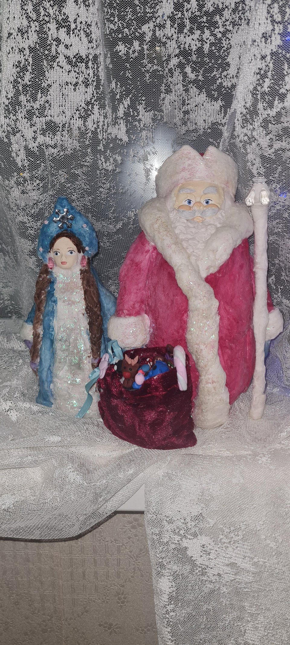 Возраст 9 лет Материал: Вата, клестер, полимерная глина на лицах, акварельные краски, техника декупаж для декора спины дед Мороза.