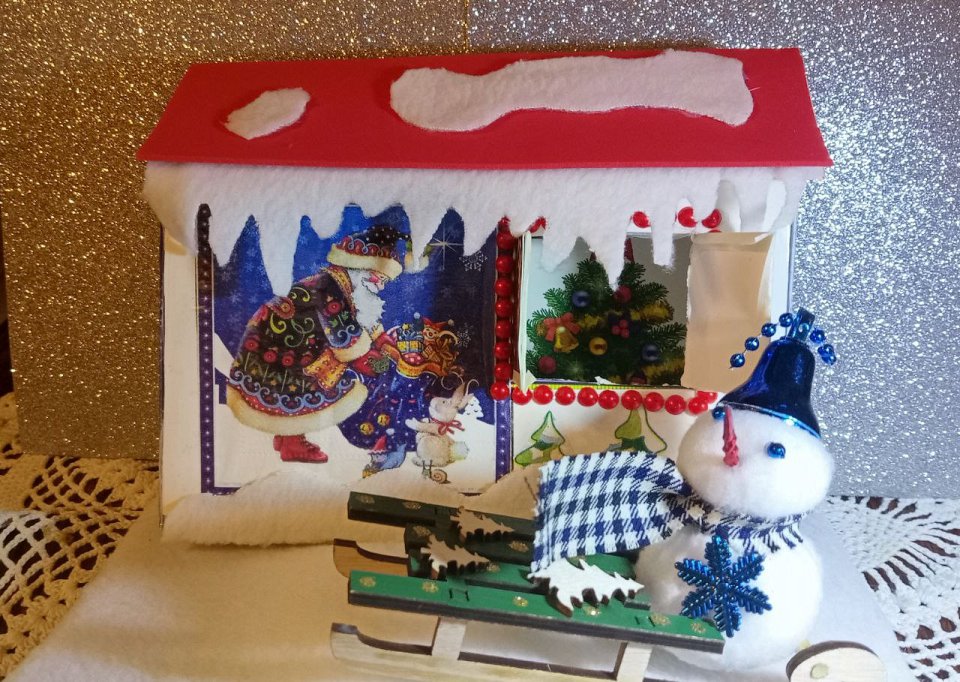 7 лет, поделка из картона, новогодние салфетки, синтепон белый, красный фоамиран, снеговичок из синтепона, пластиковые колокольчик,шапочка и носик.