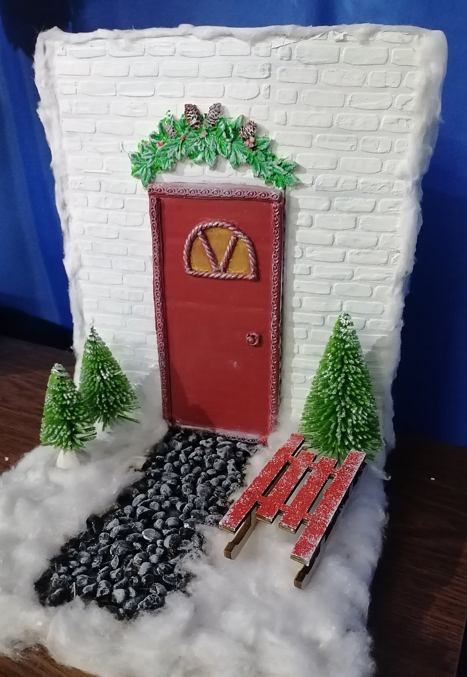 Автору 12 лет. Работа выполнена из картона. Рельеф стены нанесен шпаклевкой с помощью трафарета, объемный декор сделан из полимерной глины с помощью молдов. Окрашено акриловыми красками.