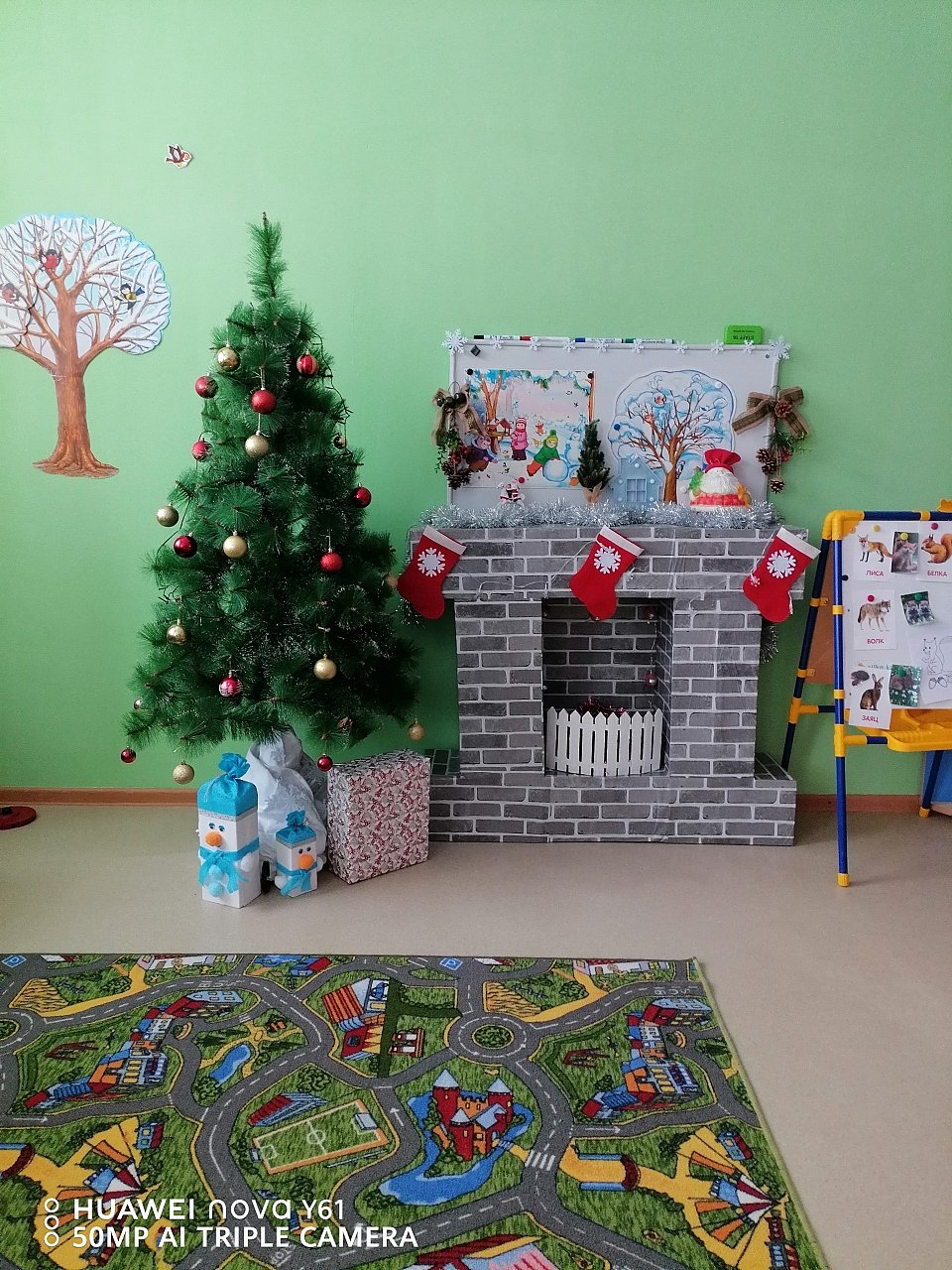 Уголок оформлен с помощью картона, обёрточной бумаги, елка, игрушки, гирлянды, интерьерные украшения.