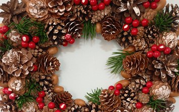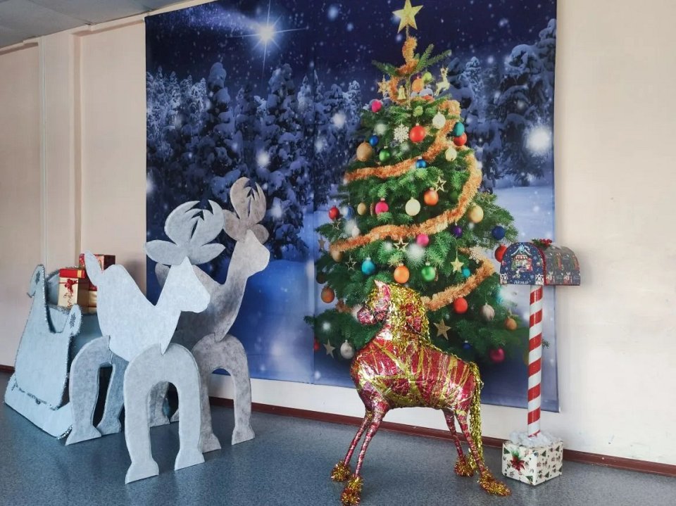 Олени и сани выполнены из коробок, обклеены обоями. Панно на стене-это шторы, сшитые и закрепленные на потолке с помощью лески.