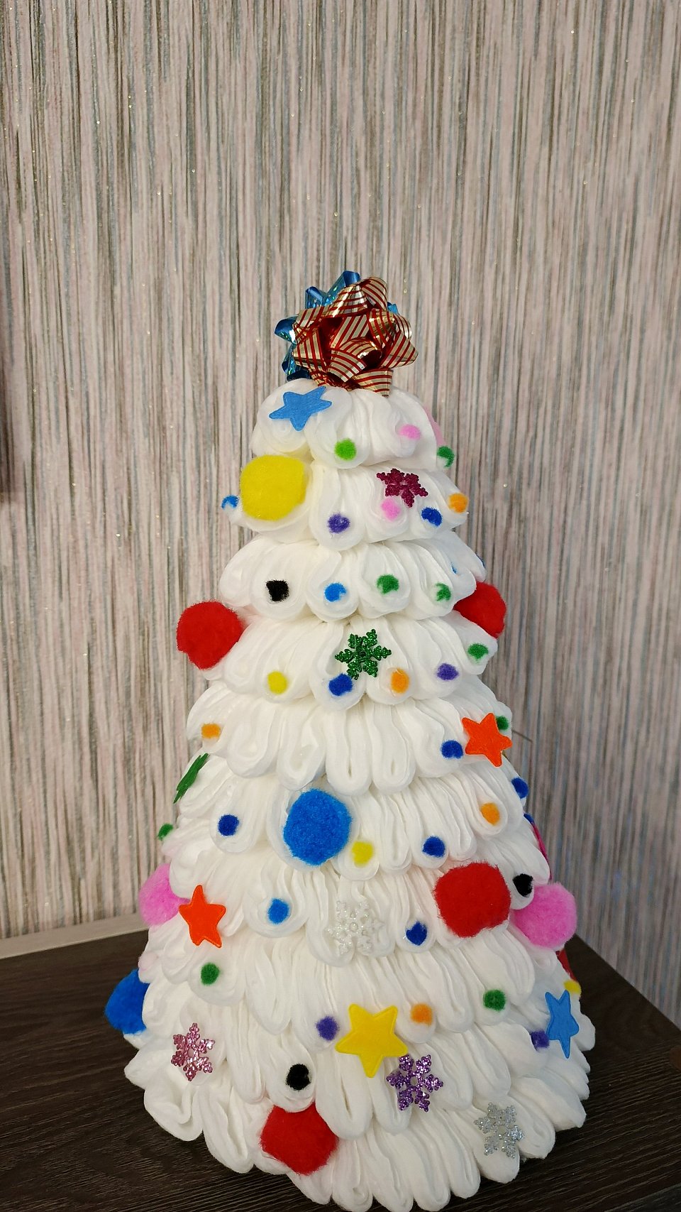 Изготовлена из картона. Ватных дисков. Украшения мягкие