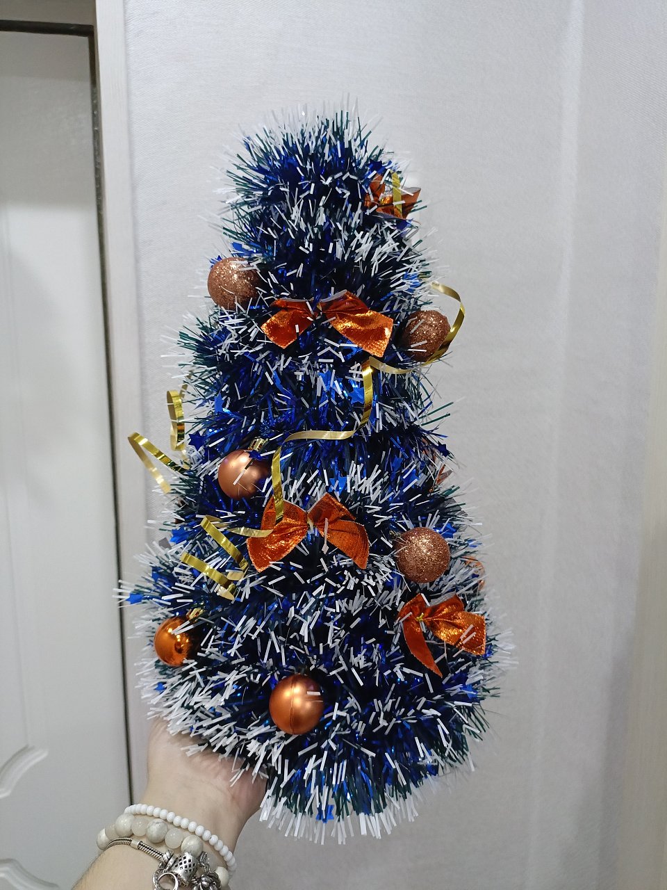 6 лет, работа выполнена из мишуры, бантов , ёлочных игрушек