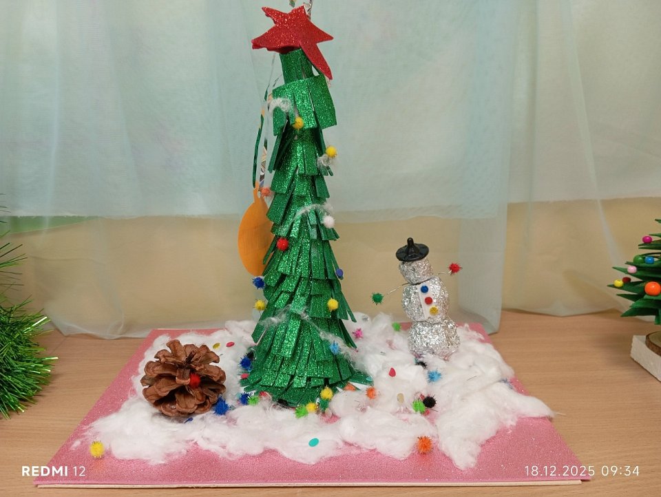 Работа выполнена девочкой 5 лет. Применили материал фоамиран, фольга, декоративные помпоны, шишка, ватные диски, картон.