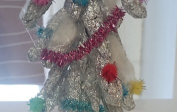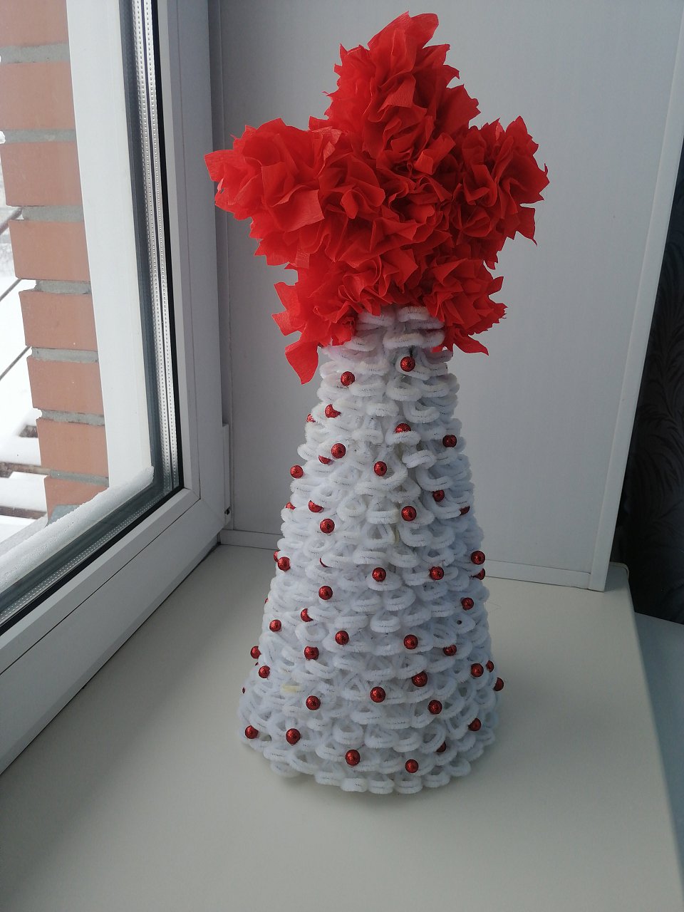 Поделка сделана из синельной проволоки, бус и гафрированной бумаги.