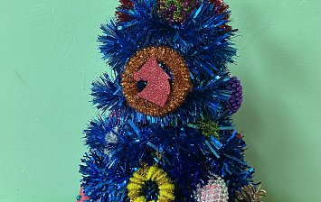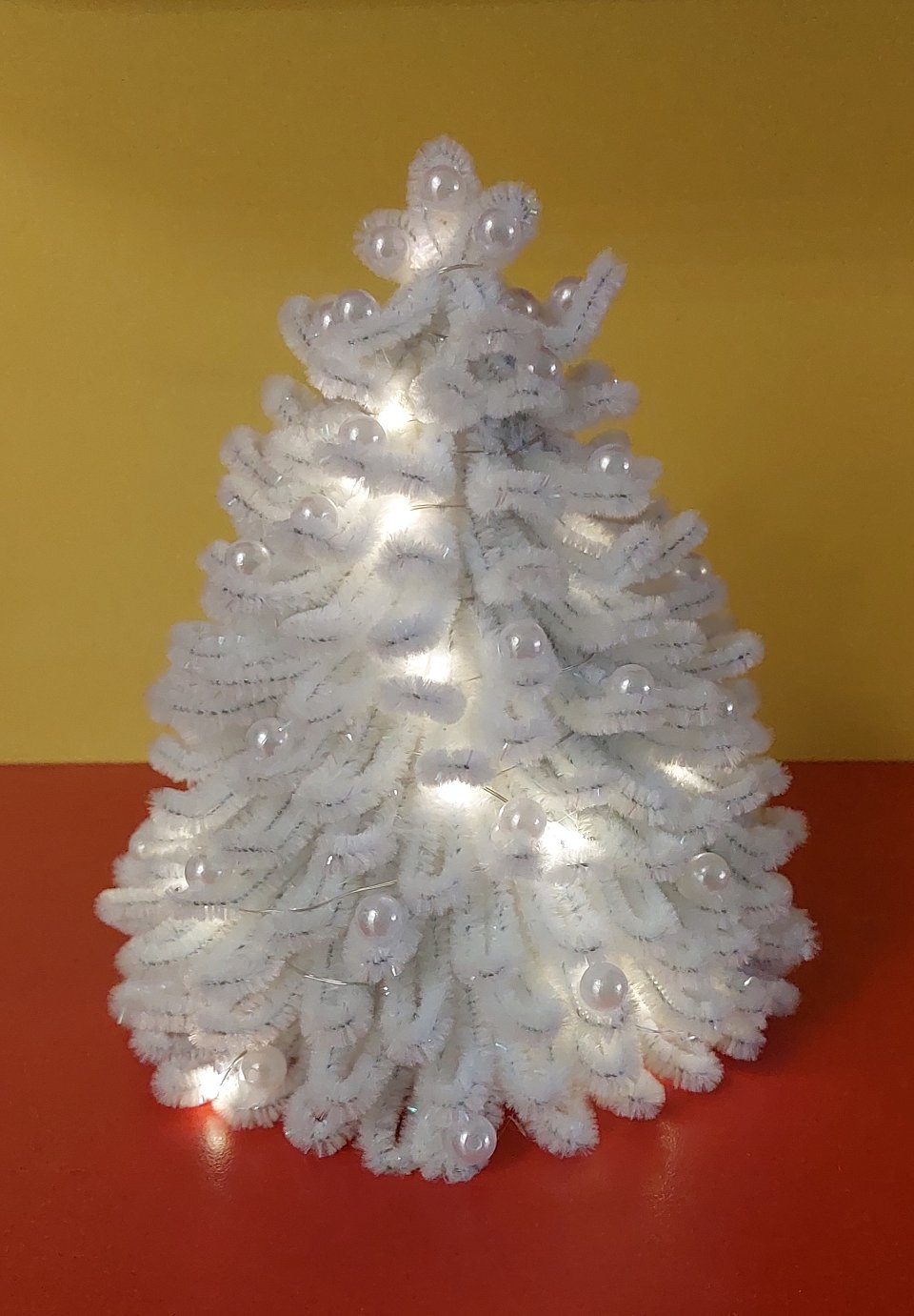 Возраст участника 3 года. Ёлочка сделана из синельной проволоки для творчества. Украшена жемчужными бусинками. Для подсветки обмотана гирляндой.