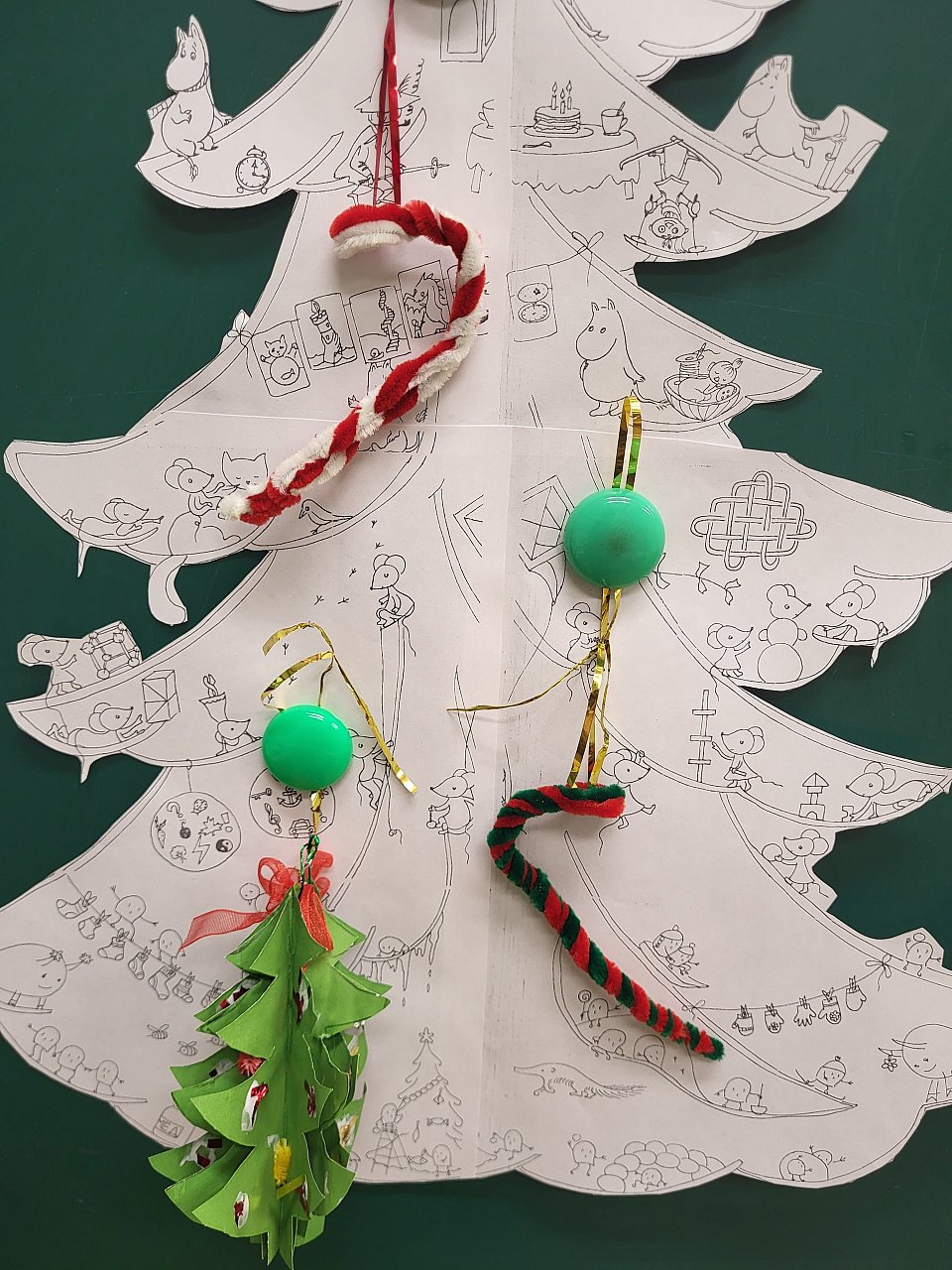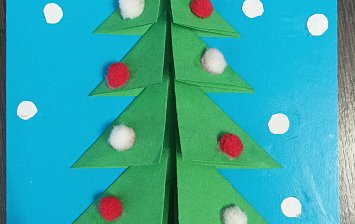 7 лет, поделка, зелёная елочка выполнена из цветной бумаги, бантик из ленточки, клей, блёстки из серпантина.