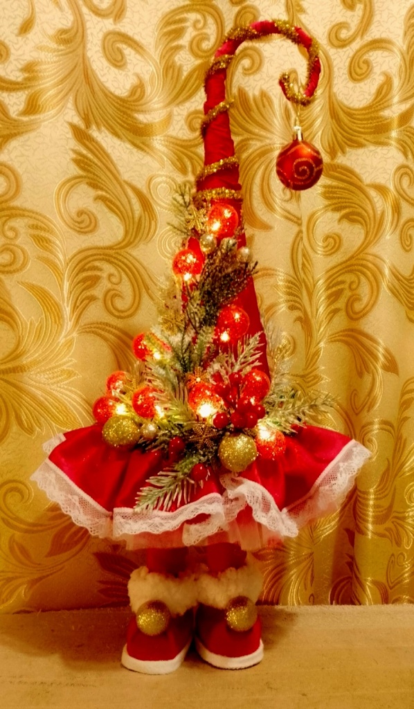 Ёлка выполнена из картона , обклеенная тканью и декорирована новогодними игрушками и огоньками.