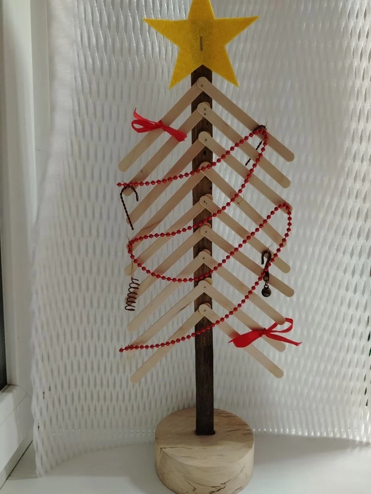 9 лет Ёлочка выполнена из дерева, использованы палочки для мороженого,фетр ,необычный декор для украшения.