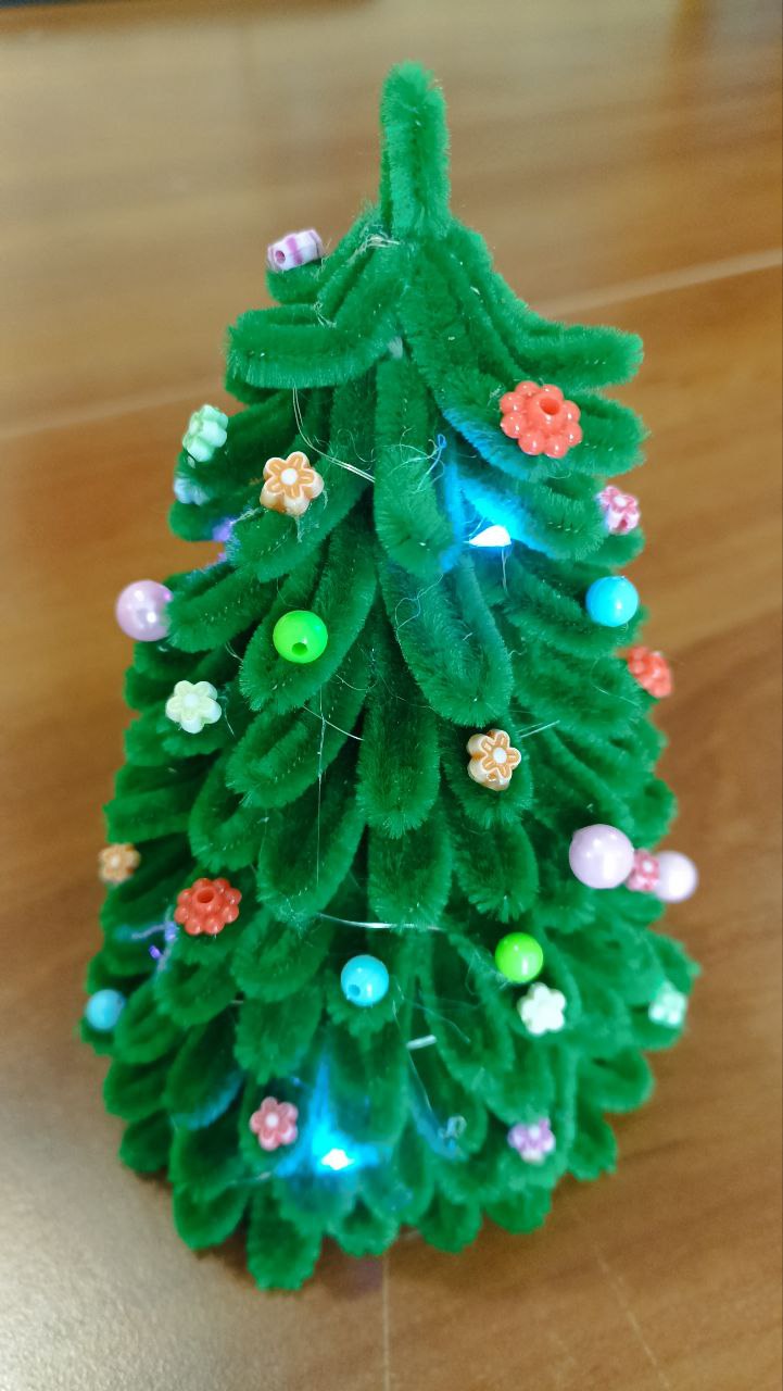 11 лет. Техника исполнения - плетение. Работа выполнена из декоративной пушистой проволоки, игрушки на ёлке - бусины для рукоделия, прикреплена ниточная гирлянда.