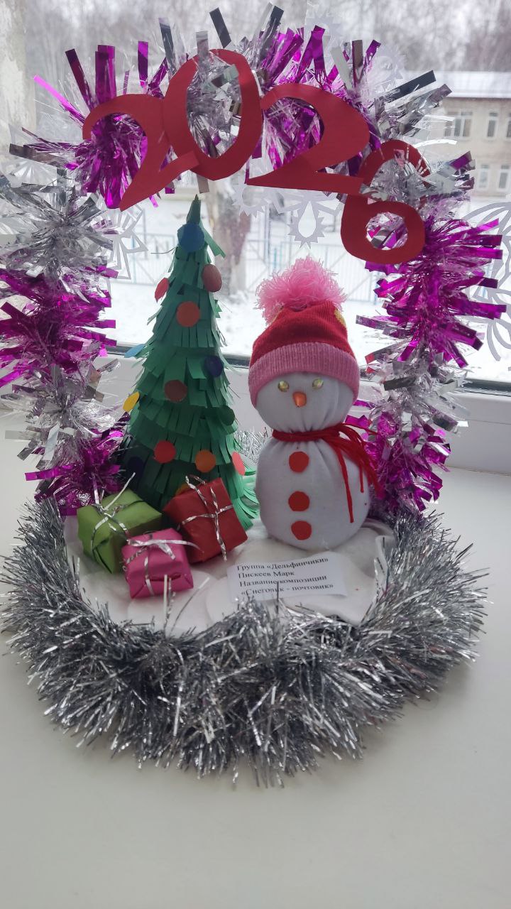 Используемые материалы - снеговик изготовлен из использованных носков, тело из белого, шапочка из красного. Елочка создана из бумаги, ограждение сделано из проволоки, обмотанной мишурой.
