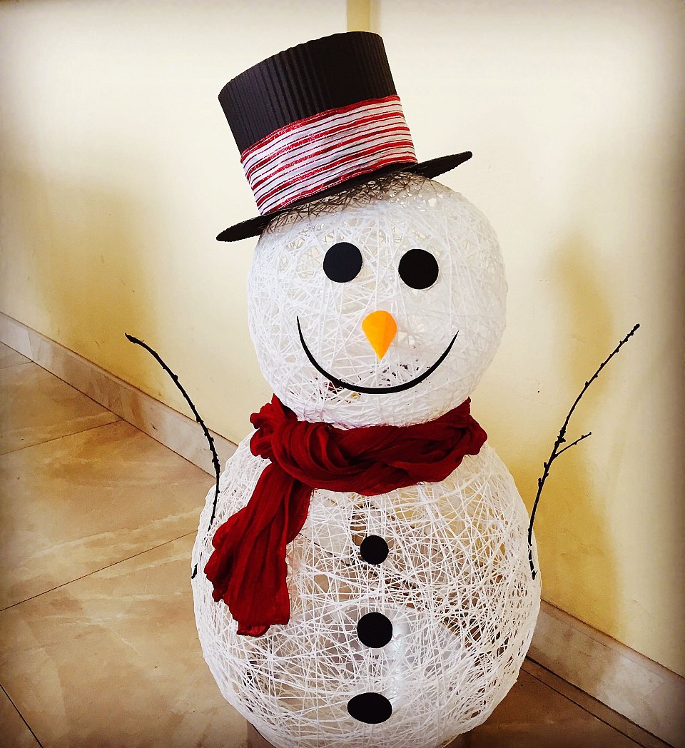 Снежные шары: Сначала мы скатали большой-большой ком для живота, потом шарик поменьше для головы. Личико и руки: Прикрепили ему веточки-ручки, морковку-носик и угольки-глазки. Рот сделали из веточки. Украшения: На голову надели шляпу , а шею обмотали ярким шарфом, чтобы ему было тепло.