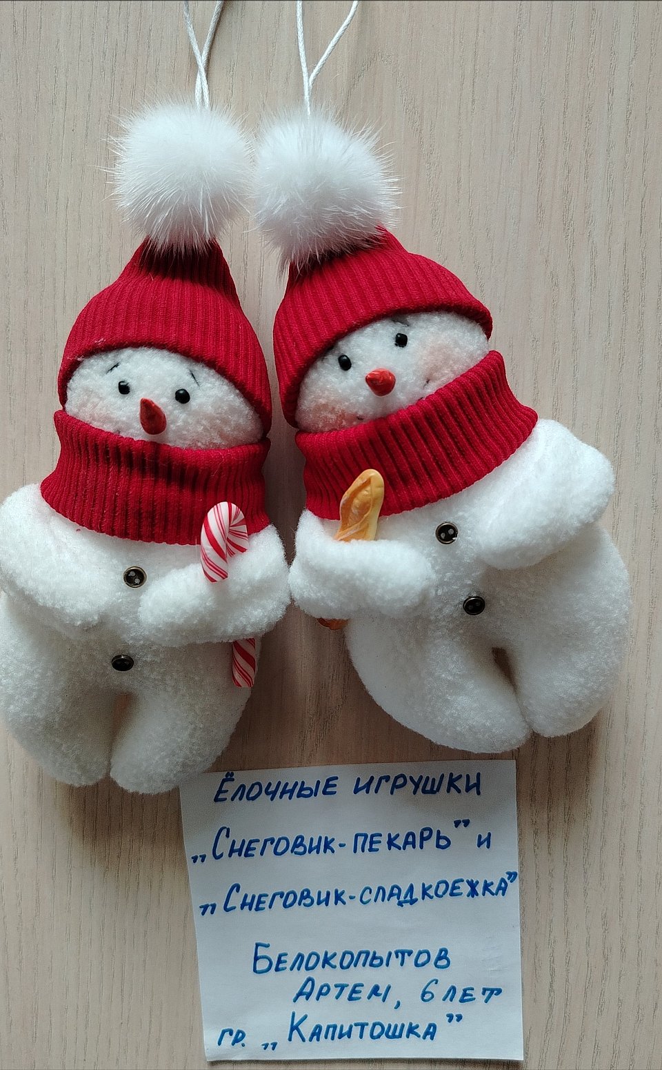 Елочные игрушки "Снеговики", выполнены из ткани совместно с воспитателем и родителями